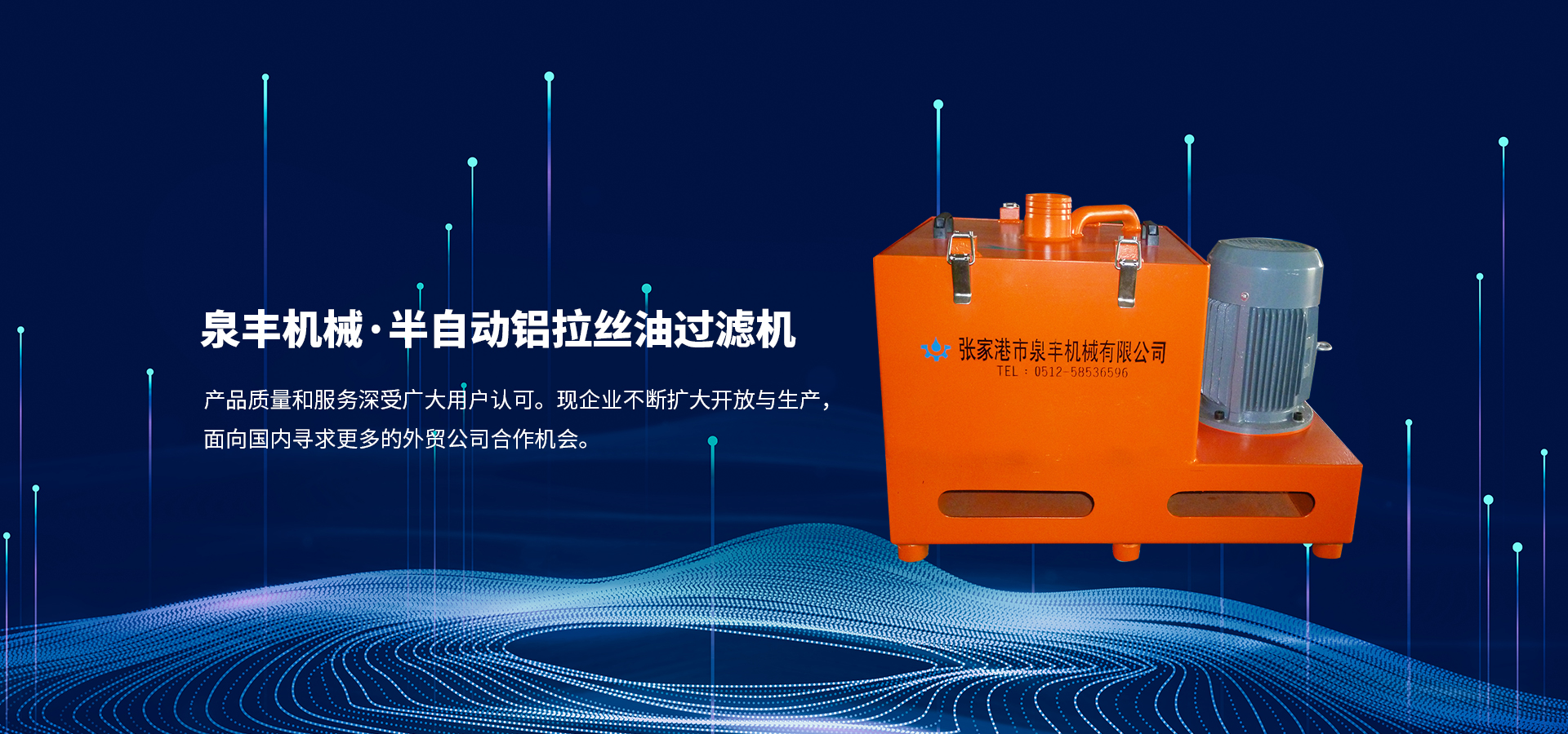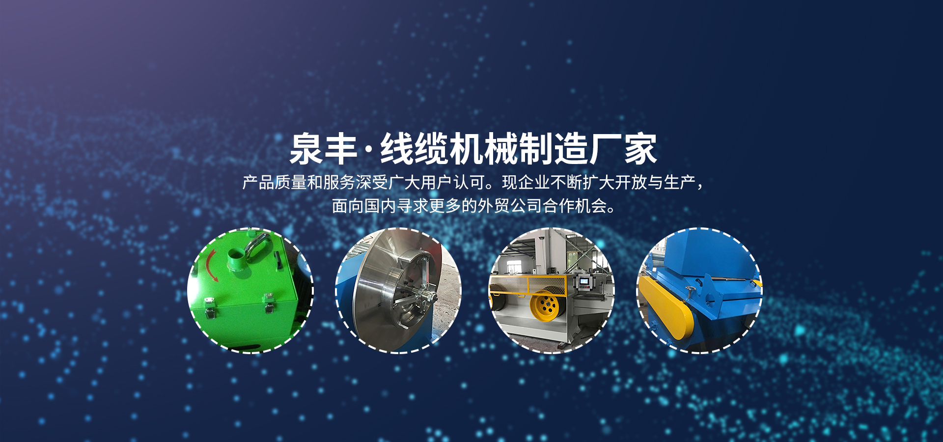 與國內多家外貿公司合作,產品遠銷世界多個地區,一直致力于電子、通訊、電力、電腦線等行業。業務包括:拉絲、退火、鍍錫、絞線、壓出等一系列纜線設備。